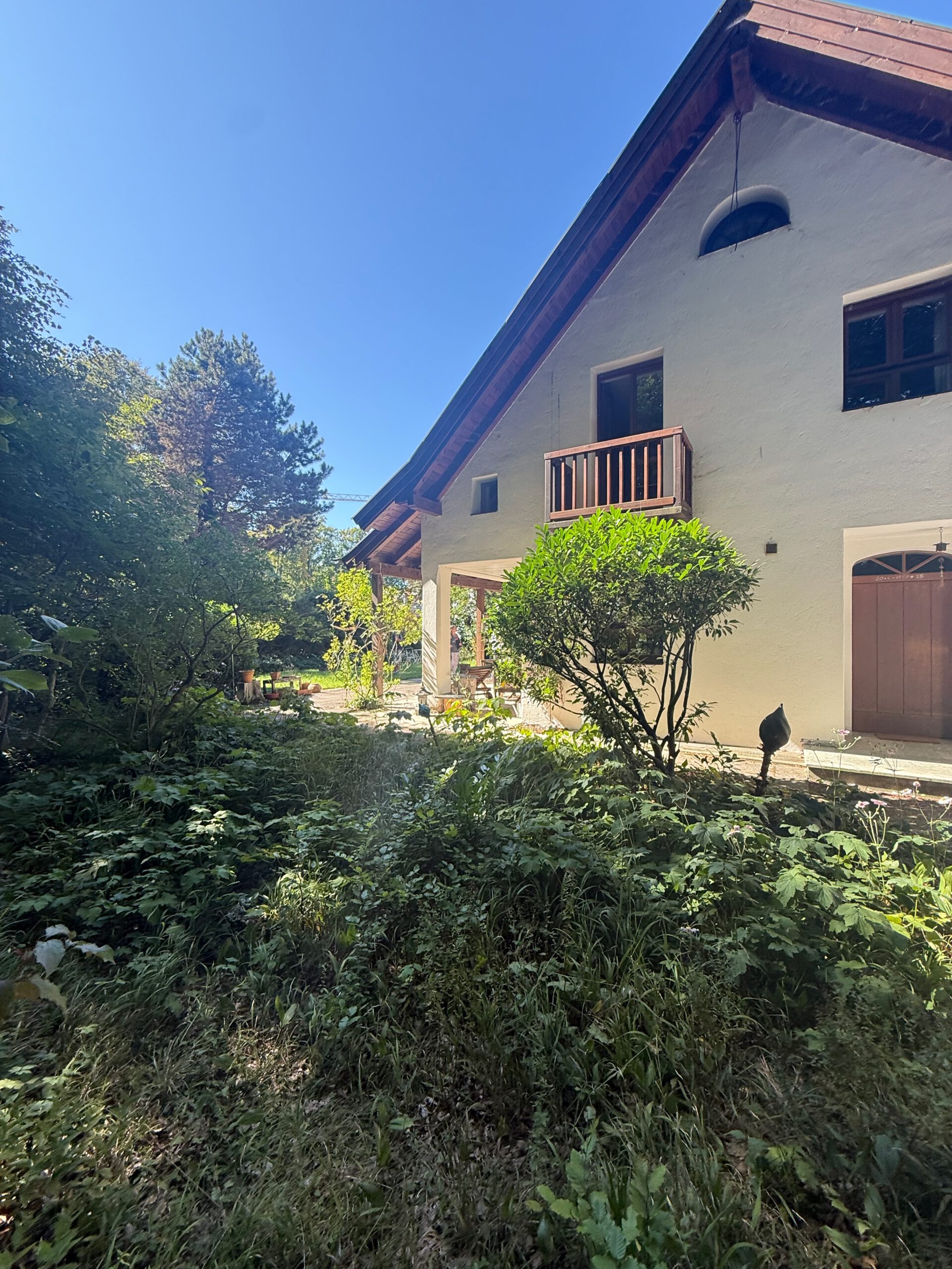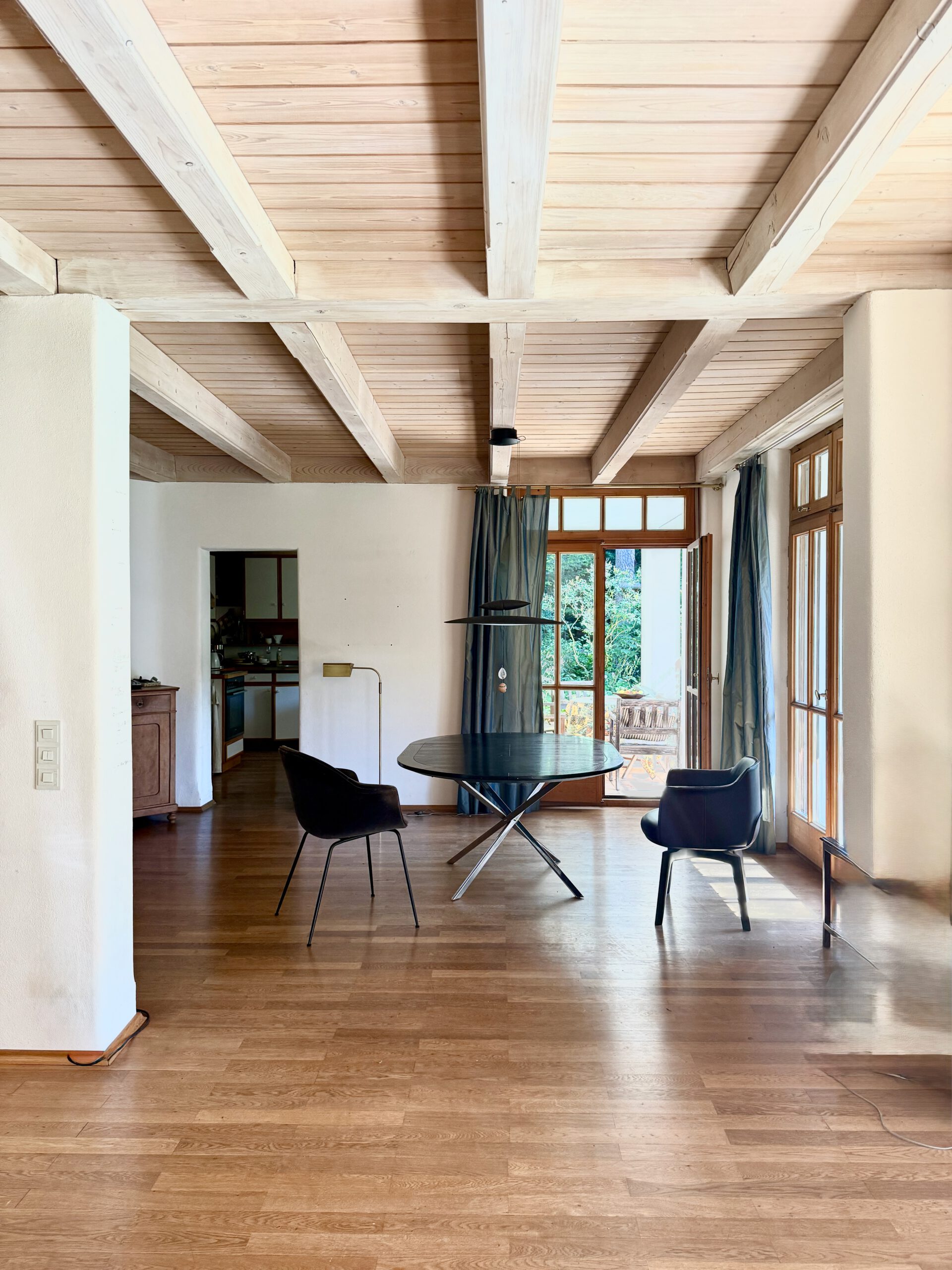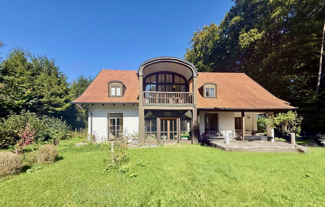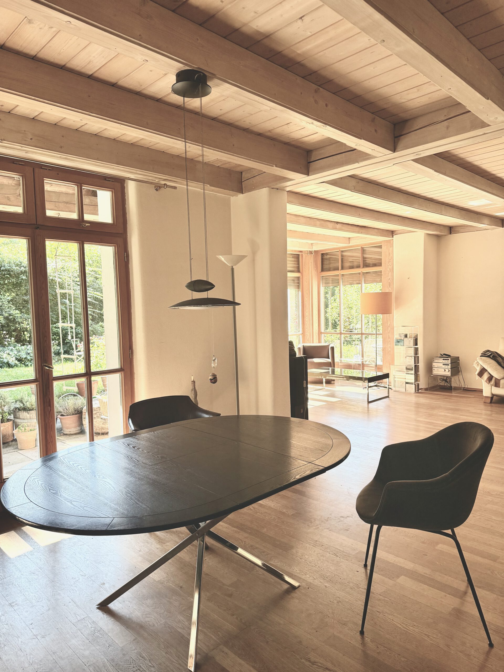 Das stilvolle Architektenhaus überzeugt mit harmonischer Raumaufteilung, hochwertigen Materialien und individueller Ausstattung nach Feng Shui. Großzügige Fensterfronten, sichtbare Balkendecken, ein Kachelofen und 2 Kaminöfen schaffen eine einladende Wohnatmosphäre.