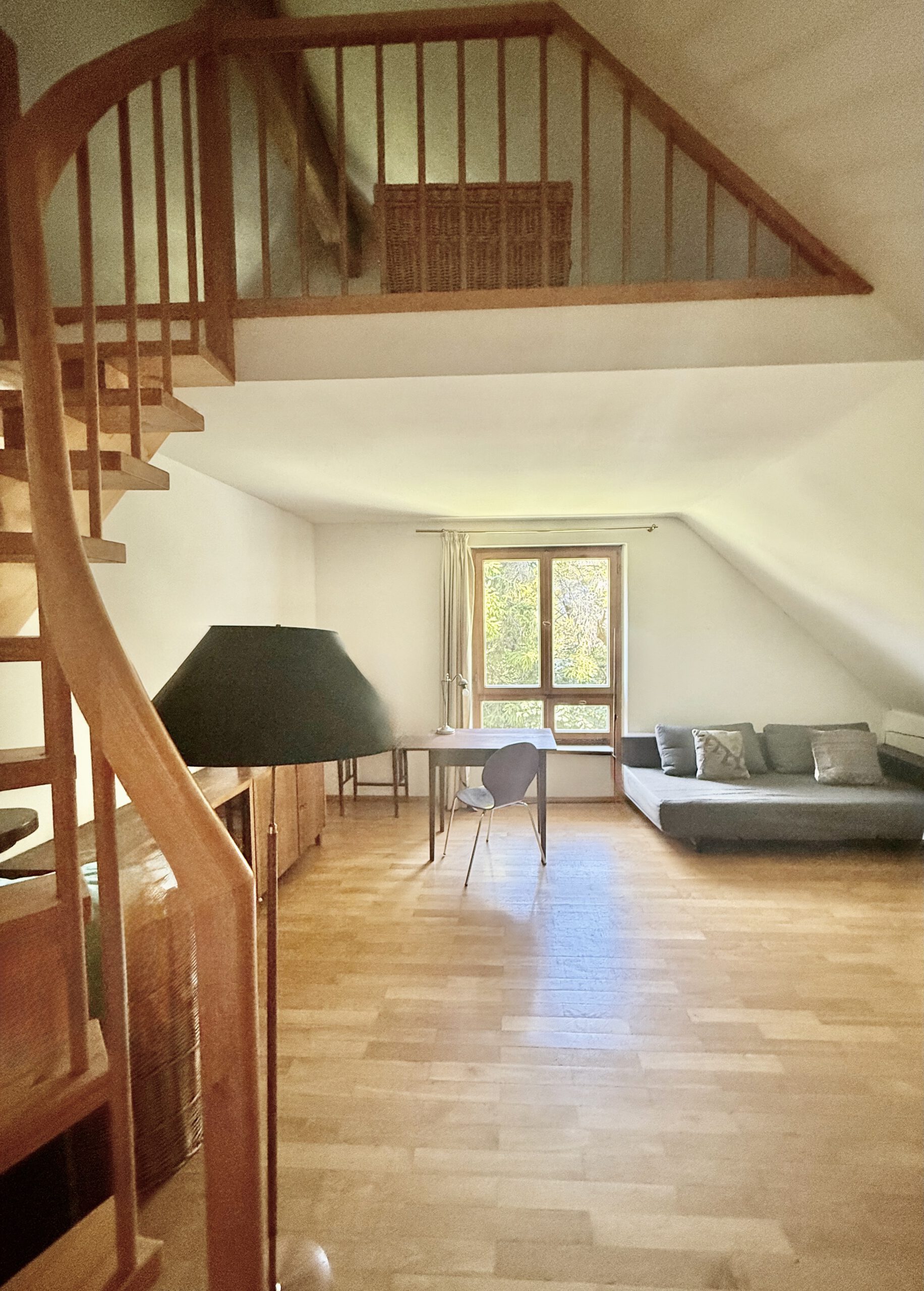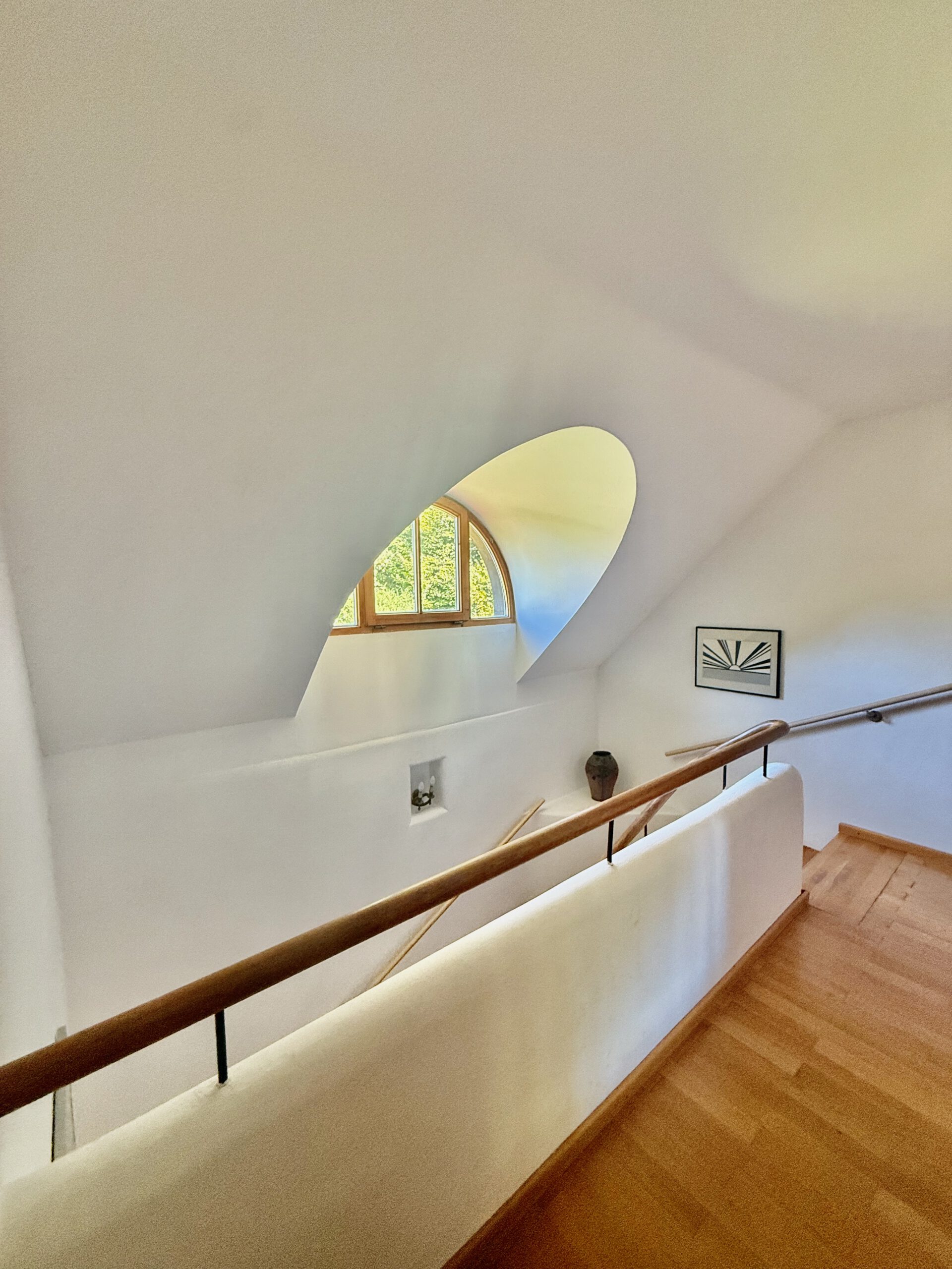 Obergeschoss: Drei großzügige Zimmer, zwei moderne Bäder, Galerie mit Rundbogenfenstern, Balkon und Küchenanschluss – vielfältig nutzbar, z. B. als Einliegerwohnung, Kinder- oder Arbeitsbereich.