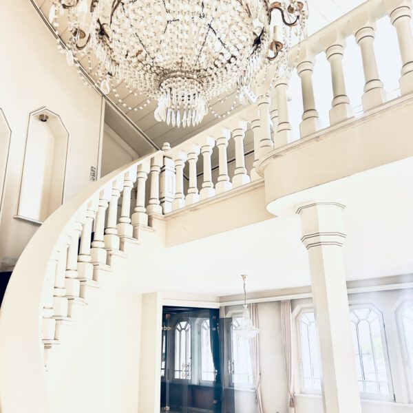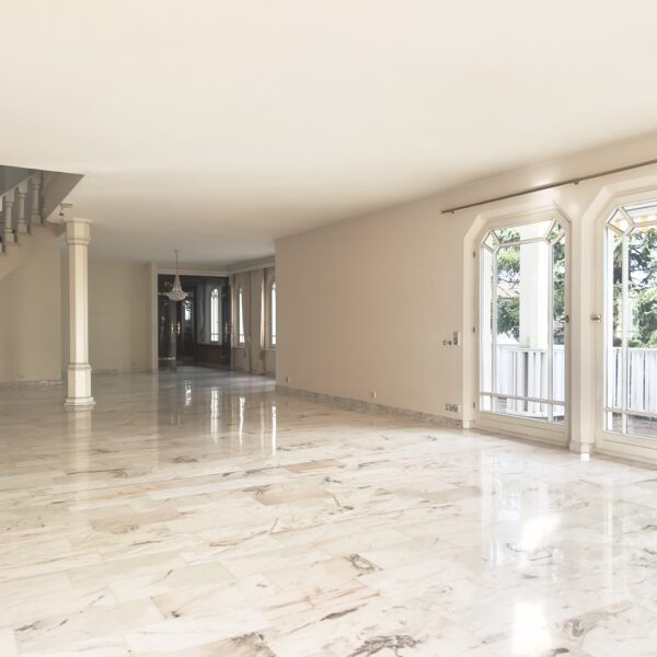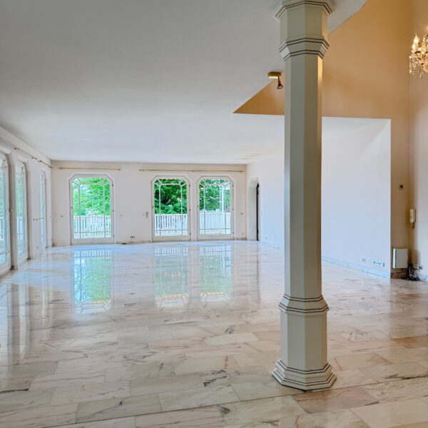Großzügiges Wohnzimmer (über 100 m2) mit Marmorfußboden, Galerie und umlaufenden Balkonen