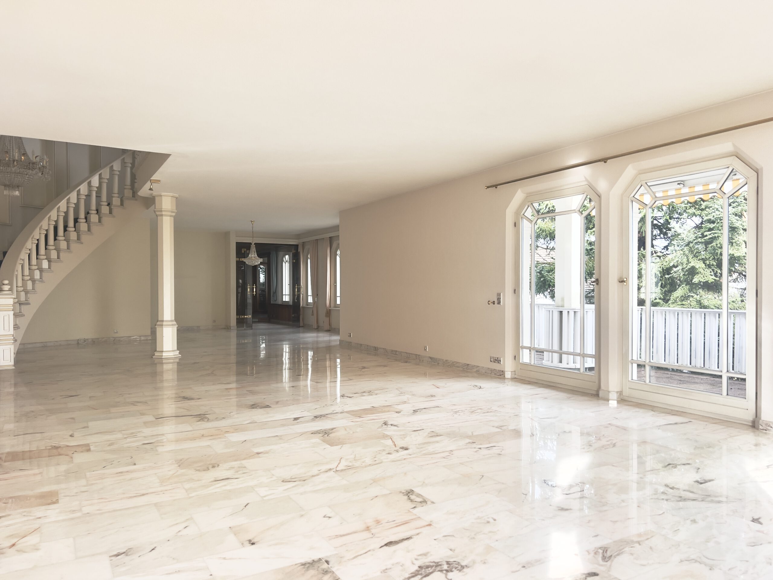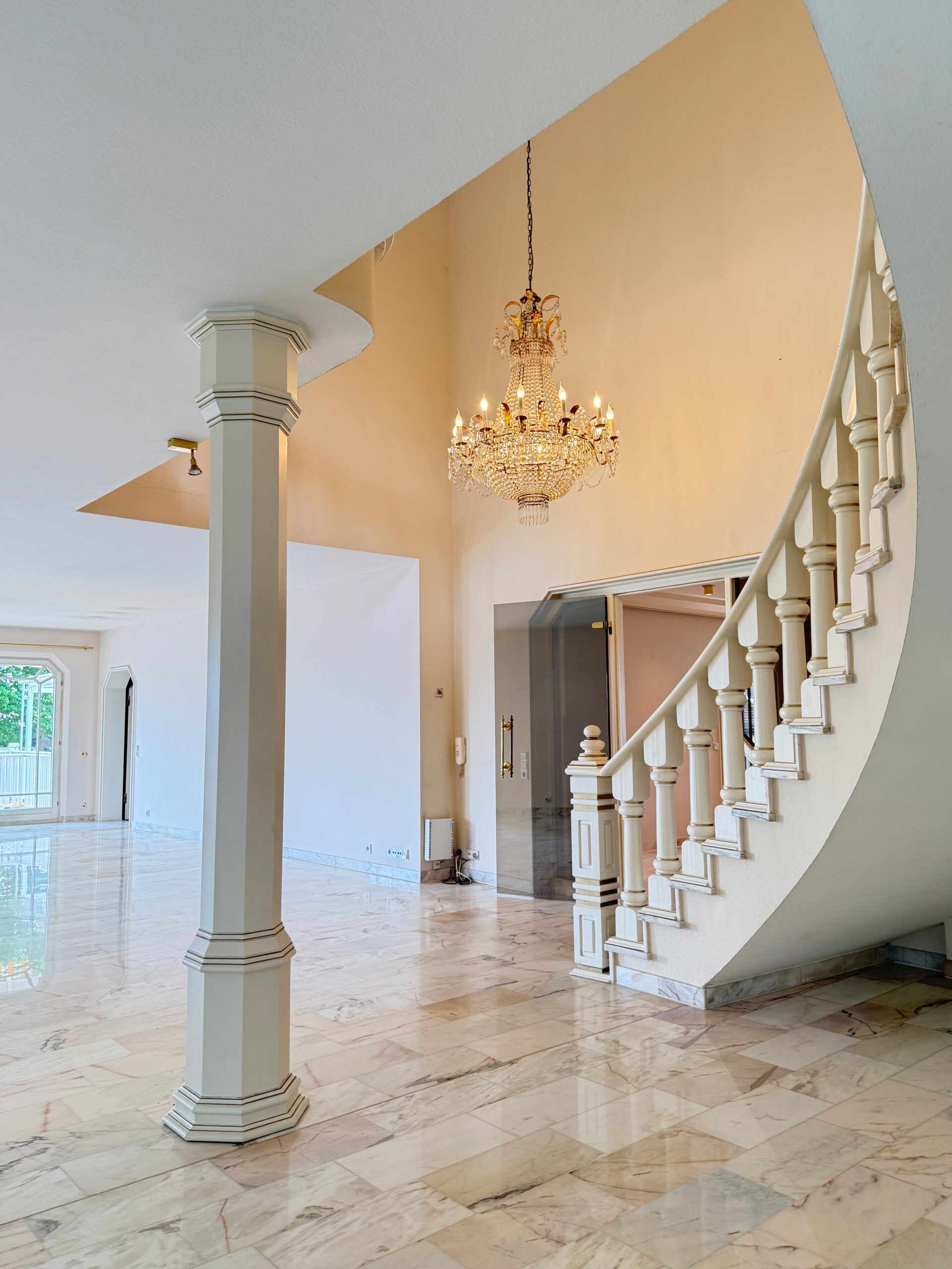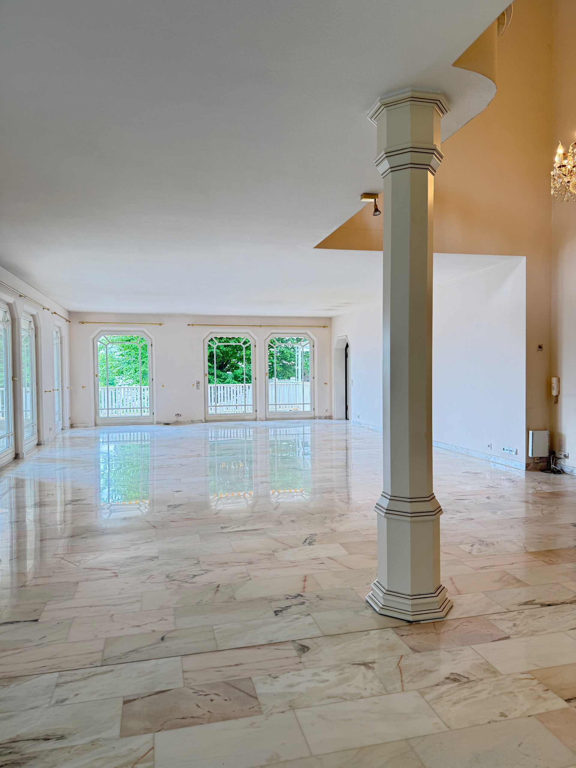 Großzügiges Wohnzimmer (über 100 m2) mit Marmorfußboden, Galerie und umlaufenden Balkonen